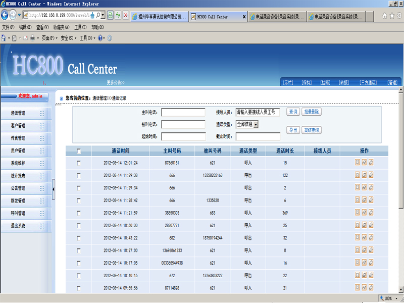 客服代表受话的次数,以及服务时间统计; 对客服代表与客户通话的录音、监听、查听;